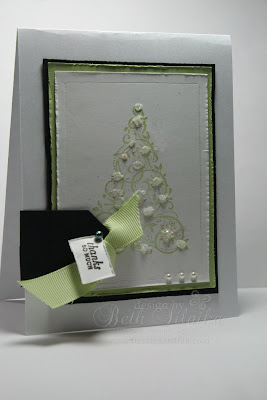 The card is based on Barbara's Card HERE. It is super elegant with all the white! I loved it! I changed the second color from purple to celery. I used the tree from Snow Swirled and the thank you sentiment from PTI mixed messages. I distressed the edges, used some crystal effects and glitter (that is where you can see the messiness - blob blob blob), and instead of the corner rounded black strip, I used the tag punch on it's side. Three pearls on the bottom and it is done!